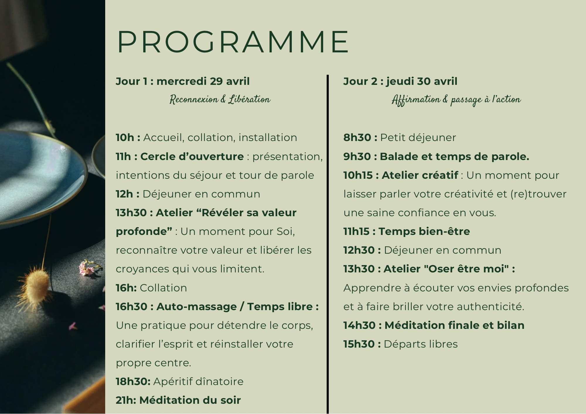 Deux jours rien que pour vous, loin du bruit et du quotidien, pour respirer et se réaligner.